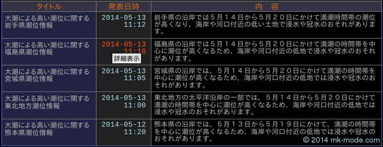 - mk-mode SITE : XML Feed 受信履歴(気象庁防災情報XML)