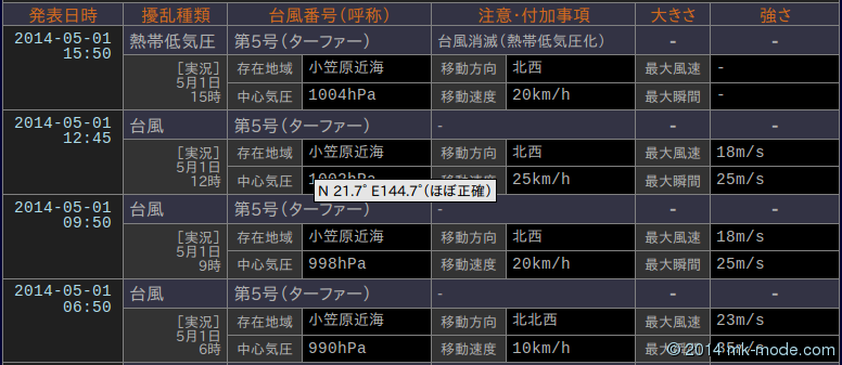 場合によっては「台風解析・予報情報(5日予報)」情報も発表されますが、実況部分は内容が重複することになるので「台風解析・予報情報(5日予報)」の情報は一覧にしていません。