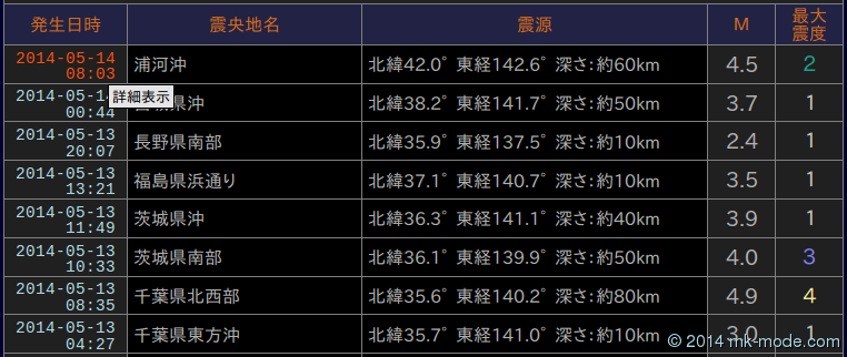 さらに、その他に「顕著な地震の震源要素更新のお知らせ」、「地震回数に関する情報」、「地震の活動状況等に関する情報」、「東海地震予知・注意・観測情報」も情報として存在しますが、それほど情報発表のある情報でもないので「一覧ページ」は作成していません。(「DB ページ」は作成していますが)