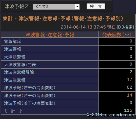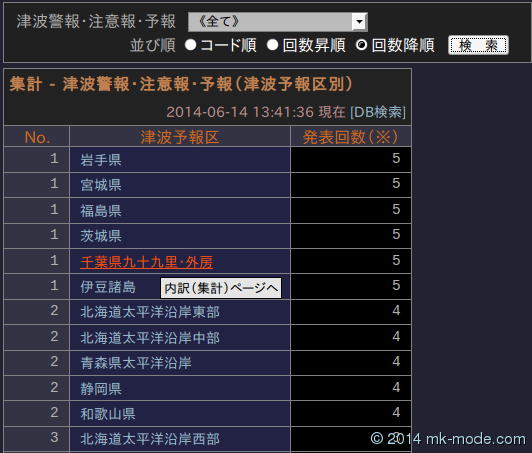 今回は、「津波警報・注意報・予報」の発表回数を(警報・注意報・予報別、津波予報区別に)集計したページを作成・公開しました。