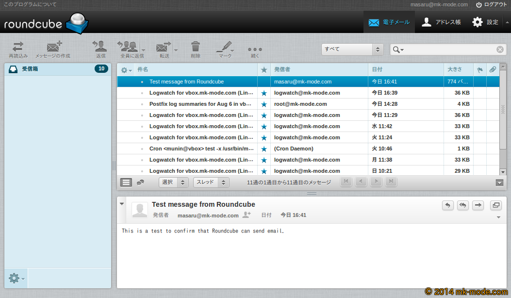 Web ブラウザで https://<サーバ名 or IP アドレス>/roundcube/ へアクセスし、メールのユーザ名・パスワードでログインできること、各種操作が可能なことを確認する。