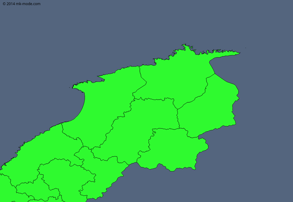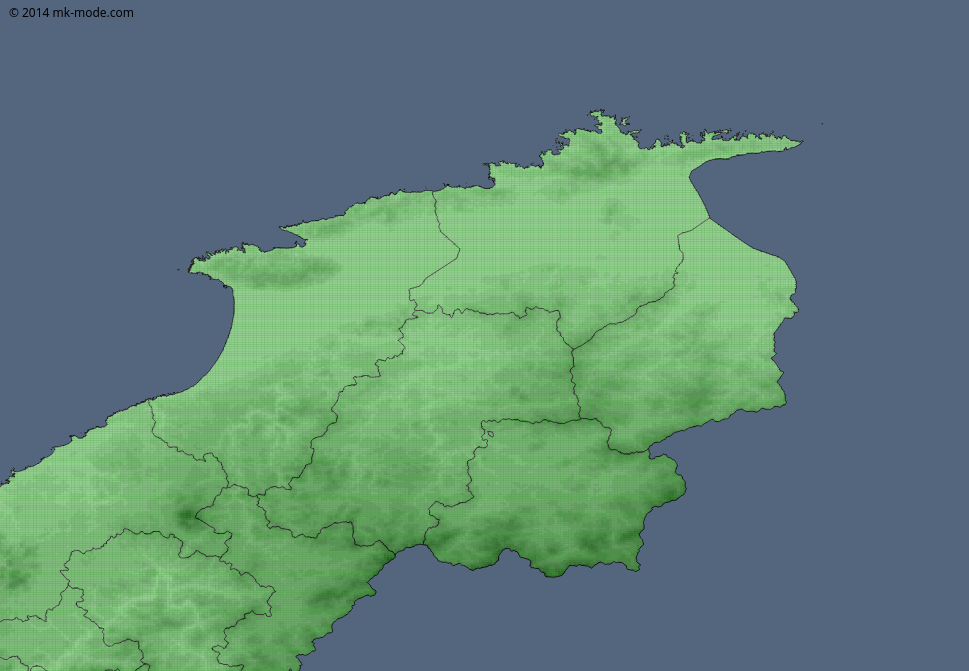 せっかく「行政区域データ」もあるので、行政区域データを標高・傾斜度データの下側に置いて「色」を濃い目の緑色にし、「標高・傾斜度データ側の透過率を “50%” に設定してみた。(行政区域データの境界線は透過にせずに残して)