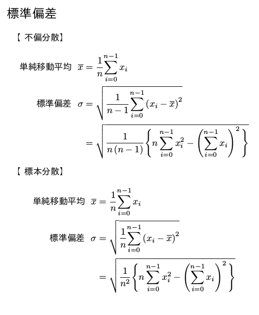 標準偏差 \ \ \sigma & = & \sqrt{ \frac{1}{n-1}{\displaystyle\sum_{i=0}^{n-1} \left( x_{i} - \overline{x} \right)^{2}} } \\