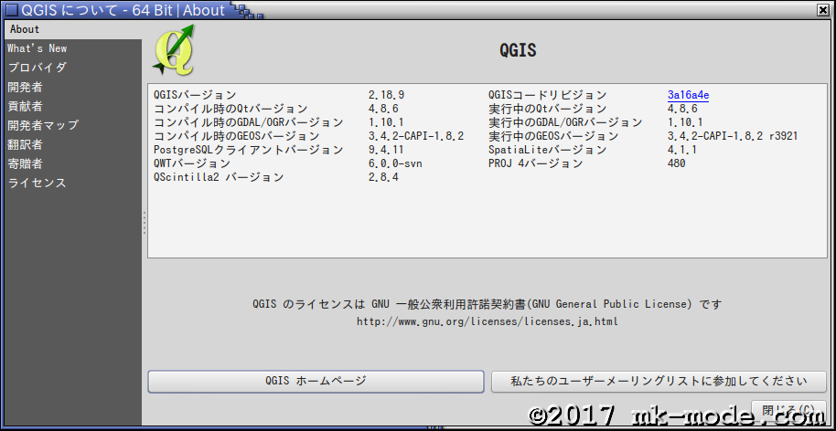 以下は、「QGIS Desktop」を起動して「ヘルプ」ー「QGIS について」を確認したところ。