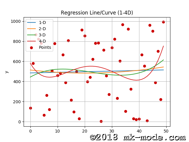 先日、 Python で2つの list から単回帰曲線(二次回帰)を計算するアルゴリズムを実装しましたが、今回は、同じ2つの list で、単回帰直線(1次)、単回帰曲線(2〜4次)を計算して、結果を比較してました。