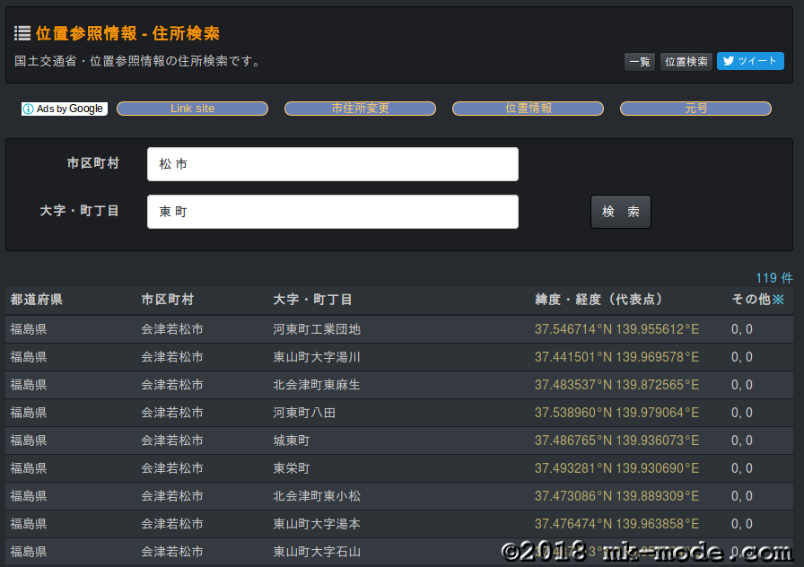 国土交通省・国土政策局提供の位置参照情報(大字・町丁目レベル)を住所ベースで検索できるページを自 Web サイト内に設置しました。