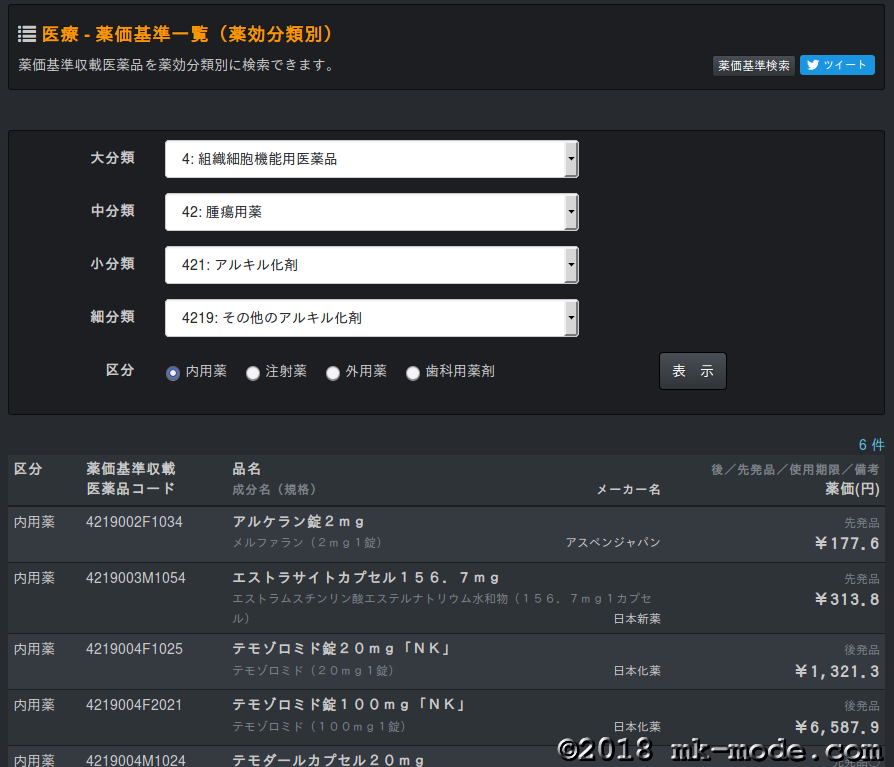 - 薬価基準収載医薬品の一覧は、厚生労働省「医療保険が適用される医薬品について」から取得した表計算ファイルを CSV 化&整形して MariaDB に取り込んでいる。(CSV 化する際は、薬価の3桁区切りカンマ等に注意)