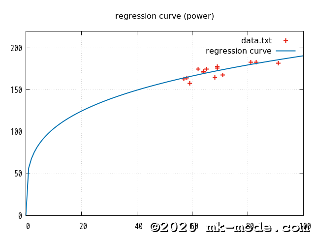 C++ で、数値からなる同サイズの配列2つを説明変数・目的変数とみなして単回帰曲線(べき乗回帰モデル)を計算する方法についての記録です。