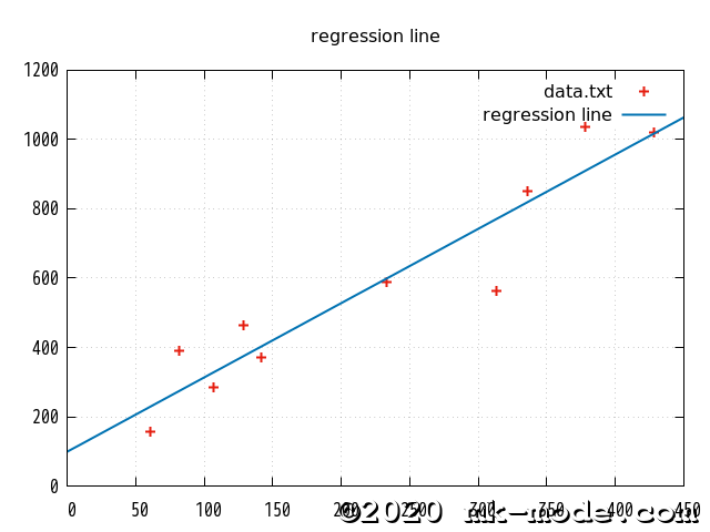 参考までに、上記で使用した2変量の各点と作成された単回帰直線を gnuplot で描画してみた。
